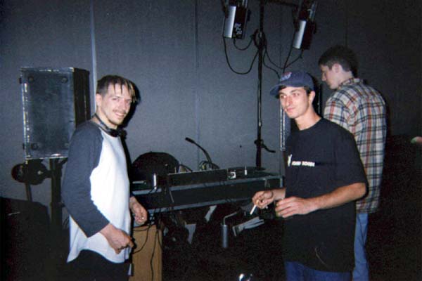 Dangerous levels of sleep-deprivation, plus more stress than a brain surgeon on a deadline. I can understand what did it, but our friend Dave here just snapped. There was nothing we could do, and so we just left him to smoke cigarettes and laugh at the lighting fixtures. Note Ron and Joe "Dark Cube" Stanovitch in the background. I don't know what they were doing, but it probably wasn't helping. |