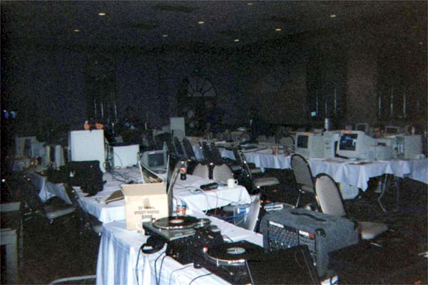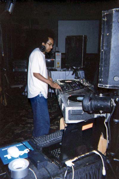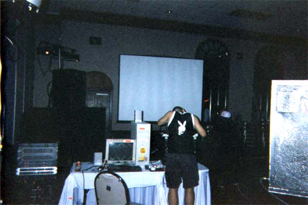 This is just a cool picture. DJ Somethingorother spins some "phat" music while bathed in an eerie magenta glow. It was probably something burning, but who am I to stop it? My credo has always been, "If it doesn't look good, don't even bother," and I suppose the opposite is also true. |
