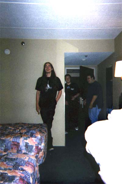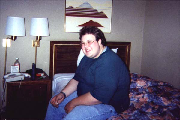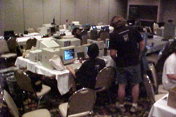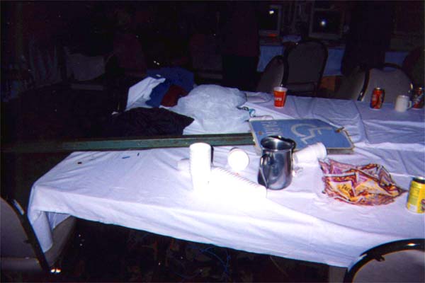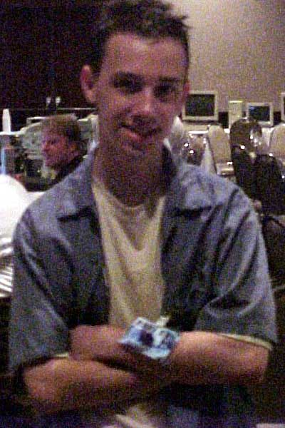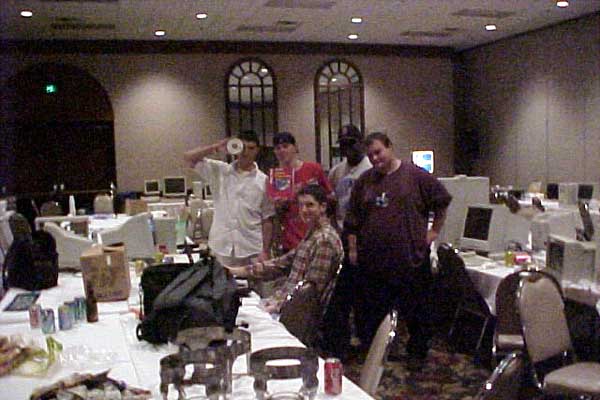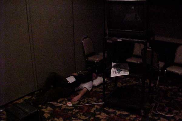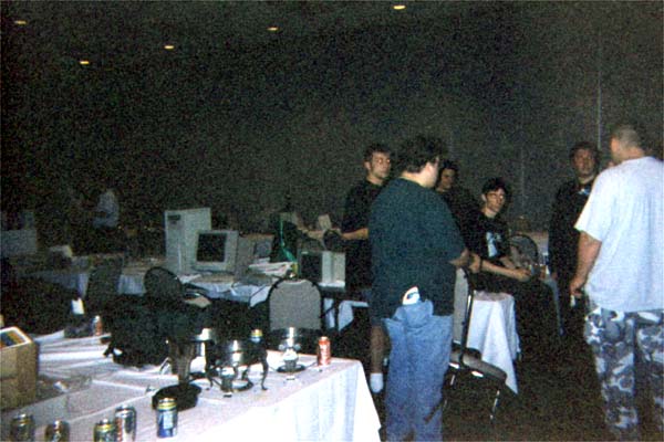 This kid holds the honor of being at the center of what was voted the Best Stupid Story of Rubi Con 1999. Such as it is, this fellow is only 15, and apparently had to beg his parents into letting him go to Rubi Con this year. He had a deal with them that he would be home on Saturday night at midnight, and he must have forgotten because at around 4:00 am his parents storm into the conference area desperately searching for there son. Your's truly was sleeping at the time, but enough people were still awake to launch a search of the hotel. I was soon roused and made an honest attempt to calm the parents, least they sue me or something equally silly. Anyway, an hour or so later a small pile of cloths in the corner of the Machine Room was poked and, low and behold, there he was. He had been asleep, curled up on the floor, not 10 yards from where his parents had been pacing and screaming the entire time. I snickered quietly to myself and went back to bed. He, it can be surmised, will probably not be back next year... |