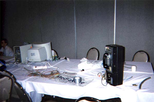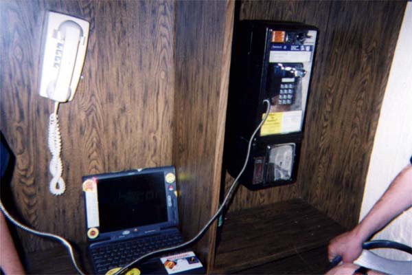 Pay phones, computers, piles of rainbow-colored wires. Yep, it really was a computer con. |