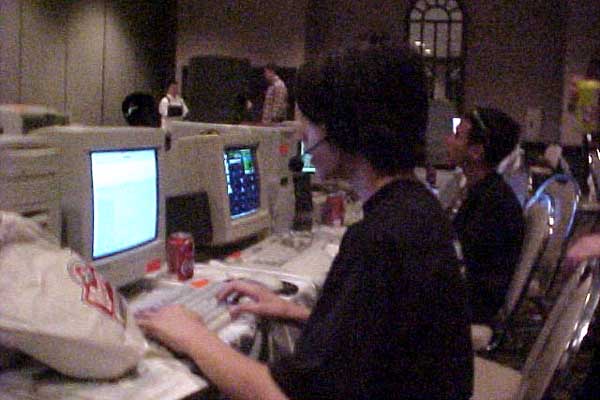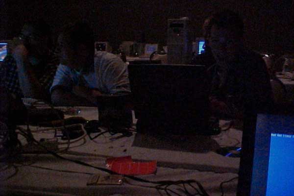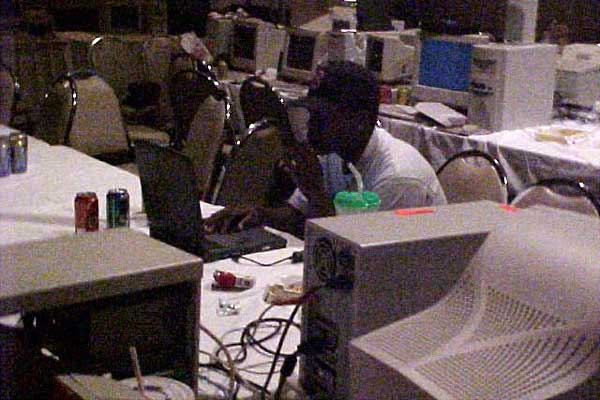 Here we see one of our attendees as he single-handedly breaks into the NORAD missile-command mainframes ala "Wargames." Now, he didn't touch-off a nuclear war with his tinkering, because he is a benevolent hacker and he understands that billions and billions of dead people would be bad. But I though it was impressive enough to include a picture of anyway. |