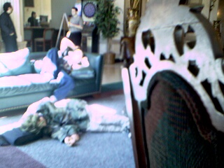 Pimpin in a ghetto hotel suite. "Whats that cable out the window?" :)
