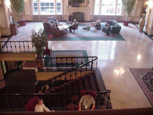 a look down on the main lobby, otherwise known as the "universal rubi-con bedroom".
